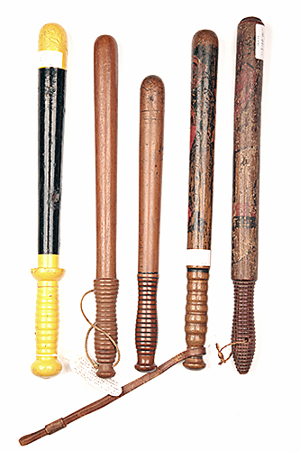 FIVE WOOD TRUNCHEONS, including one marked to the 'ST. PETER-PORT S.C.', a black and yellow painted example from the Bombay Police, a plain boxwood example marked '2 INSP.R', a possibly Victorian painted example with a Royal Cypher and another with a painted city shield, the last two worn with loss to detail (5)