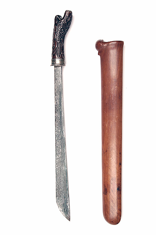 A 19TH CENTURY KLEWANG, from the Malaysian archipelago, with straight broadening etched pattern welded blade, white metal collar, carved wood hilt and plain wood scabbard