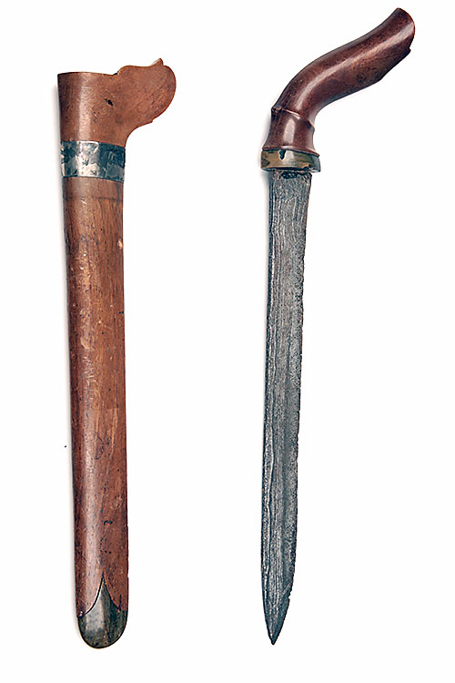 A LARGE MALAY KNIFE, mid 19th century and of 'Bade-Bade' style but with straight etched pattern-welded blade, carved smooth wood hilt with horn collar and scabbard with white and yellow metal mounts