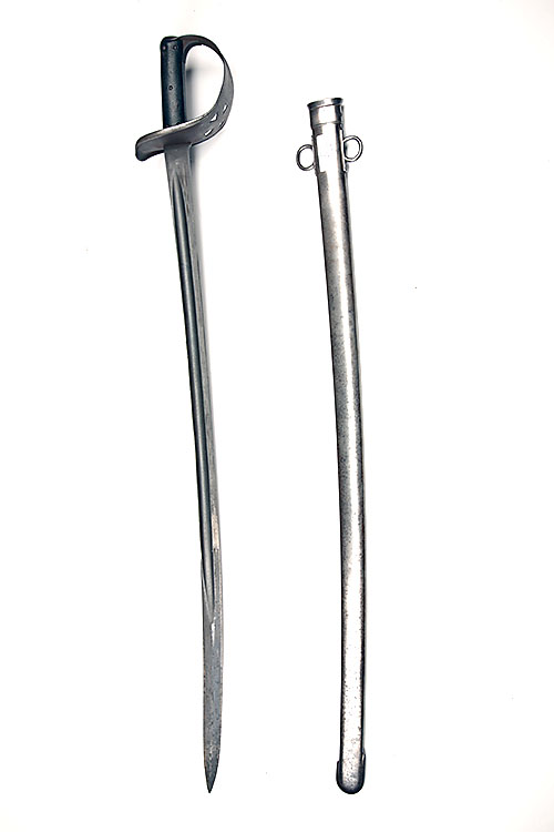 A BRITISH CAVALRY TROOPER'S PATTERN 1882/1885/1890 SWORD, long version with issue stamps to 1903, slightly curving broad fullered 34 1/2in. blade, sheet iron basket with rolled edges and pierced with a Maltese cross, chequered hard rubber grip and complete with its iron scabbard, the throat marked 'Y' over 'S.TF' over '19'