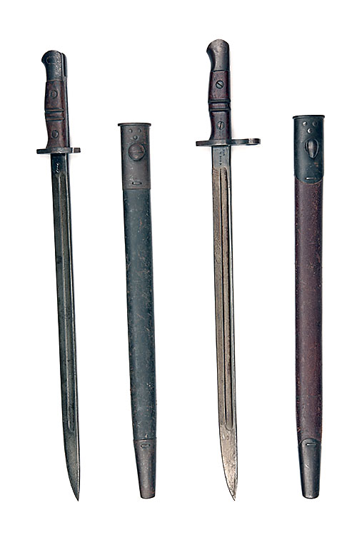 TWO P13/17 BAYONETS, both with scabbards and by Remington, one with muzzle-ring ground off (2)