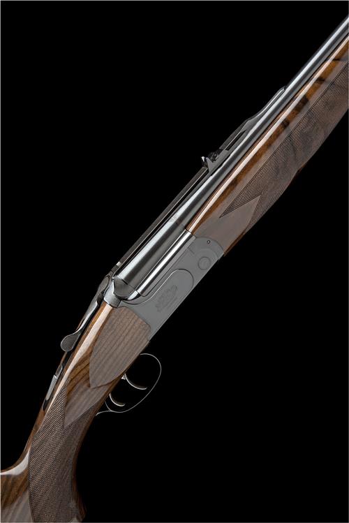 Cat. no. 16496, 25 3/4in. nitro barrels with file cut sight rib, open sights with folding leaf sight and ramp-mounted sprung high visibility fore-sight, hold-open toplever, manual safety, border engraving with floral scroll details, blacked finish, the triggerplate signed 'inc. Ri. Pa.', 15 3/8in. pistolgrip stock with cheekpiece and including 3/4in. rubber recoil pad, weight 9lb., in its universal take down case with paperwork and sighting target