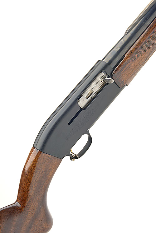 FABRIQUE NATIONALE 12-BORE (2-SHOT) 'TWELVETTE' SEMI-AUTO SHOTGUN, serial no. 78597, serial number on barrel only, 25in. nitro barrel with 6mm raised ventilated matt rib, 2 3/4in. chamber, bored approx. 1/4 choke, blacked action with dotted border and flashes of acanthus scroll engraving, manual trigger safety, gold-washed trigger, 15 1/4in. replacement stock including 11/16in. rubber recoil pad