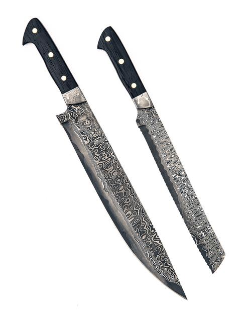A DAMASCUS CHEF'S KNIFE TOGETHER WITH A DAMASCUS BREAD KNIFE