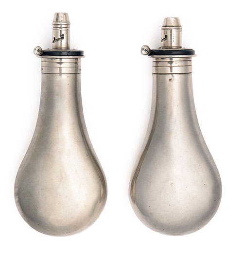 A RARE COMPOSED PAIR OF NICKEL-PLATED POWDER-FLASKS,