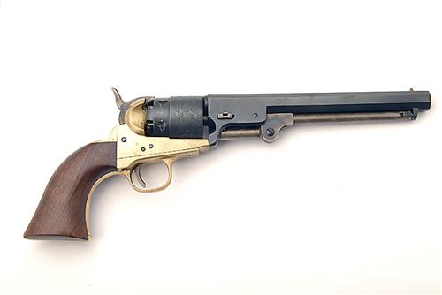 A REPRODUCTION .44 PERCUSSION REVOLVER, SINGLE ACTION, SIGNED ASM, serial no. B31224 with a blued octagonal 7 1/2 in. sighted barrel, scene engraved cylinder, brass frame, flame hardened press parts and plain walnut grips.