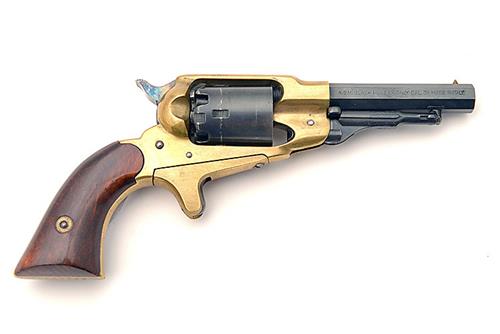 A REPRODUCTION .31 PERCUSSION REVOLVER, SIGNED A.S.M., MODEL REMINGTON NEW POCKET, serial no. E57349 with a blued octagonal 3 1/2in. barrel, a plain blued 5 shot cylinder, closed brass frame, spur trigger, plain walnut grips