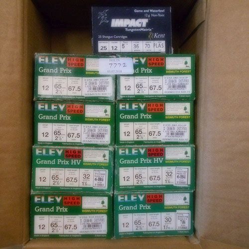 TWO HUNDRED BISMUTH AND TWENTY FIVE TUNGSTEN 12 BORE CARTRIDGES comprising of 200 rnds 12-bore 2 1/2 inch, 32gm 4/5/6/7/ shot, fibre wad, bismuth by eley and 25 rnds 12-bore 36gm no 5 tungsten matrix by eley 2 3/4 inch.