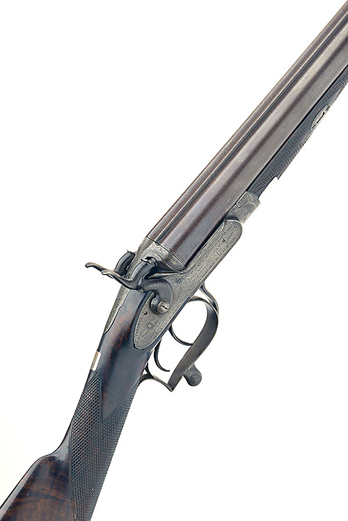 JOHN MANTON SON & COE. CONVERTED 16-BORE ROTARY-UNDERLEVER HAMMERGUN, serial no. 11110, 29in. black powder only damascus barrels (heavily pitted, dented), the rib engraved in script 'JOHN MANTON & SON. DOVER STREET. LONDON.', 2 1/2in. chambers, bored approx. true cyl. in both, carved percussion fences, non-rebounding locks, square-backed triggerguard, border and acanthus scroll engraving,14 1/4in. stock with elongated top-strap, weight 7lb. 1oz.