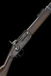 probably Belgian, with 23 3/4in. barrel (external shallow pitting), the rear-hinged upwards-lifting breech-block with straight bolt-handle to the right-hand side lifting and drawing back to unlock the block, Belgian black powder proofs, plain bar-action lock of military form, the hammer breast fitted with a horizontal bar running through a guide attached to the side of breech at hinge and joining via a link to the firing pin, walnut half-stock probably cut down from full at conversion, iron furniture, single barrel-band and provision for clearing rod (absent)
