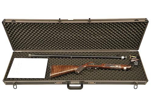 A CASED REPRODUCTION .45 PERCUSSION RIFLE, SIGNED HELMUT MOHR MAYEN GERMANY, serial no. 376 named by Helmut Mohr as 'The Henry Long' -'Long Range Rifle',with a blued 35in. round barrel having a 1:24in twist, fitted with a fully adjustable long range target foresight, a loading guide with muzzle protector, a sling swivel eye, fitted with a stripe finished walnut chequered stock with pistol grip, fine chequered steel butt cap, scroll engraved steel parts fitted with a match trigger, (missing ladder rear sight), complete with an aluminium mounted flight case