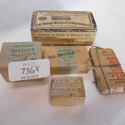 EIGHTY SIX COLLECTABLE PISTOL CARTRIDGES IN AN UN-OPENED PERIOD PACKAGES, comprising of an un-opened pkt. of 50 .38 Smith & Wesson Gallery rounds by UMC Co. 12 x .455, 12 x .388 2Z, 6 x .455 Webley Mk II in a paper pack dated 1902 & box of 6 x 8mm Lebel pistol Mk92 dated 1939