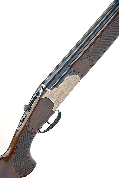 LANBER 12-BORE SINGLE-TRIGGER OVER AND UNDER EJECTOR, serial no. 262530, 27 1/2in. nitro barrels, 2 3/4in. chambers, multichokes (no spares), single trigger requires attention, game engraving, 14 3/4in. pistolgrip stock cracked at hand and including 3/4in. recoil pad, fore-end wood cracked