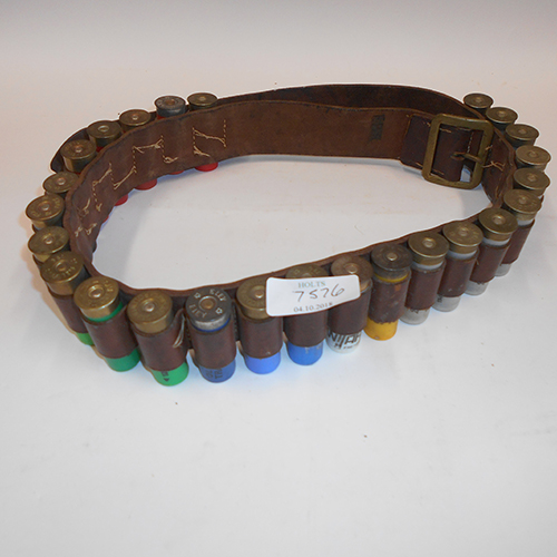 A 42 in. LEATHER 12 BORE CARTRIDGE BELT WITH TWENTY FIVE 12 BORE CARTRIDGES.