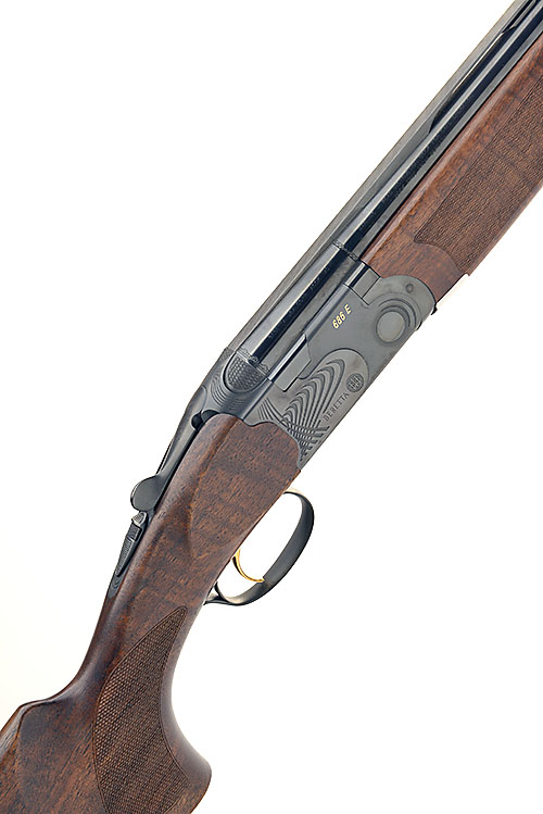 BERETTA 12-BORE (3IN.) '686 E' SINGLE-TRIGGER OVER AND UNDER EJECTOR, serial no. R20903S, 30in. nitro barrels with 8mm ventilated matt top-rib, 3in. chambers, multichokes (with spares), hold-open toplever, manual safety with integral barrel selector switch, gold-washed single trigger, satin and bright finish action with geometric designs, the underside gold-inlaid with the make and model, 14 1/2in. pistolgrip stock including 5/8in. rubber recoil pad, weight 8lb. 2oz., in its makers universal case