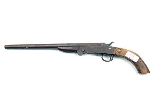 A .410 (2 1/2IN.) SINGLE-BARRELLED SHOT-PISTOL, UNSIGNED, serial no. 2044, Belgian, cut down from a shotgun and re-gripped, with 14 1/2in. barrel, side-lever opening, folding action with external hammer, replaced grip, bakelite fore-end, (bore pitted)