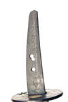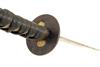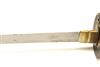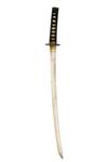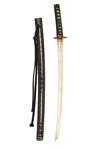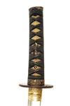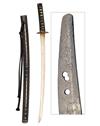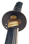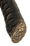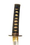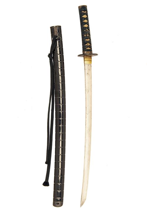 probably 17th century with later carved 'horimono' to the 21in. curved and shortened re-polished blade (slight tarnish spotting and inclusions), finely moulded gilt 'habaki', moulded circular woodgrain effect 'tsuba' pierced with a geometric five petalled flower, both the 'hitsu-ana' filled with yellow metal, short tang signed with a two character signature and pierced with three 'mekugi-ana', cotton bound rayskin hilt with single 'menuki', matching 'fuchi' and 'kashira', complete with its probable original black lacquered segmented scabbard deliberately shortened from the throat to re-accommodate the sword during its working life.