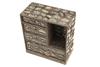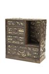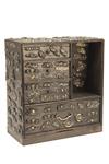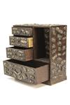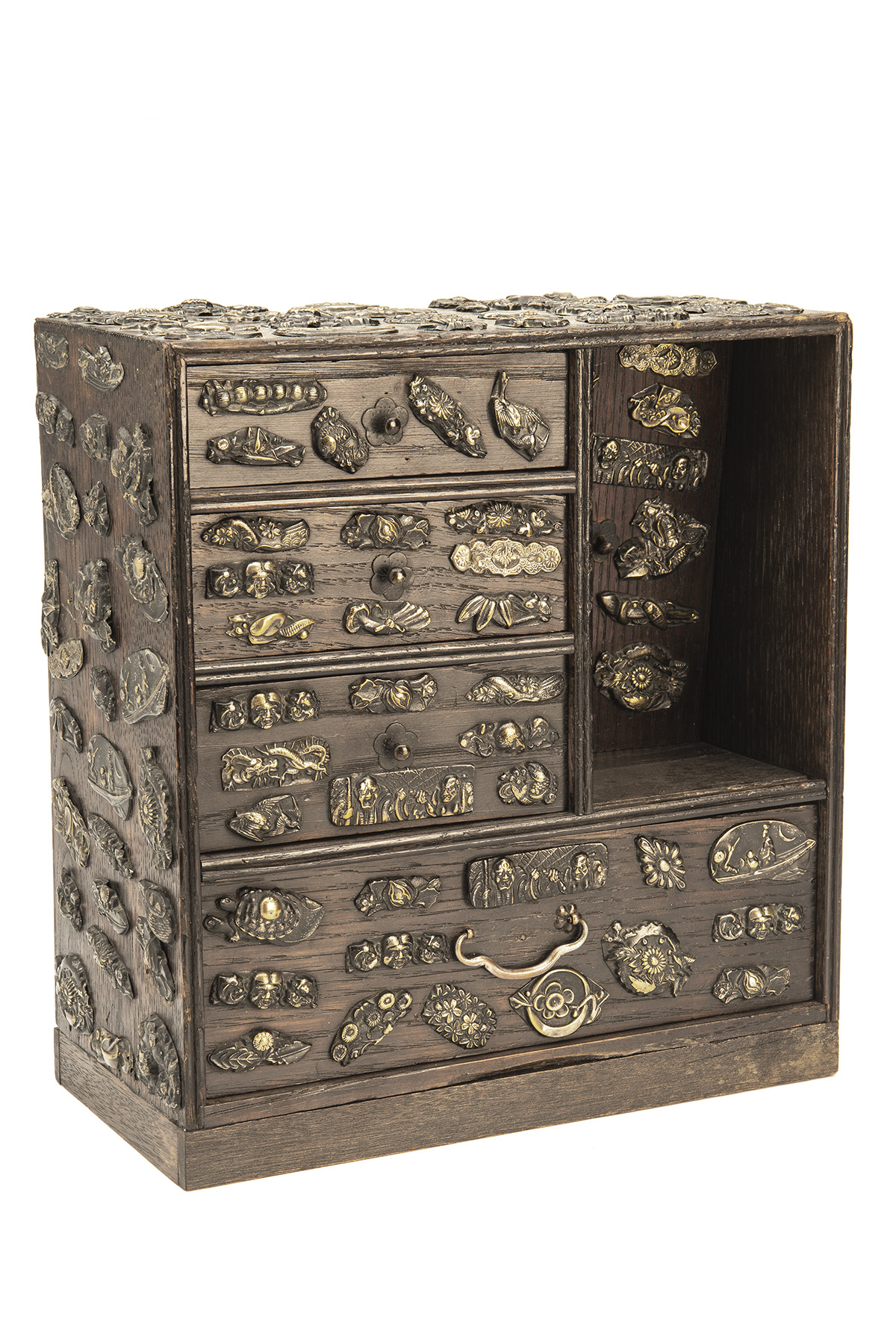 late 19th to early 20th century, the 9 1/2in. wide by 10 1/4in. tall cabinet approximately 5in. deep and fitted with a full width bottom drawer, the left hand side further fitted with three more graduated drawers, the right side with a lift-out door, the front, sides and top profusely decorated with sheet metal impressions of Japanese sword 'menuki'