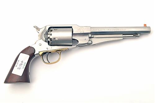 A REPRODUCTION .36 PERCUSSION REVOLVER, SINGLE ACTION ,SIGNED EUROARMS USA, MODEL 'NEW MODEL NAVY', serial no.114655 with a stainless steel 6 1/2 in. octagonal sighted barrel, a stainless steel closed frame, brass trigger guard and plain walnut grips.