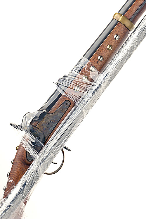 A REPRODUCTION 12-BORE PERCUSSION MUSKET, MODEL SUAVE, SIGNED ANTONIO ZOLI, serial no. 28149 AND SPARE BLUED 8-BORE BARREL serial no. 24856 with a blued round 33 in. sighted smoothbore barrel, coloured hardened lock, brass furniture and a polished full-length beech stock with steel ramrod in place and a spare blued barrel with foresight and spare steel ramrod.