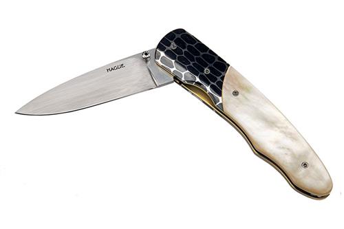 GEOFF HAGUE, ENGLAND AN EXCEPTIONAL DAMASCUS FOLDING-KNIFE, no visible serial number,