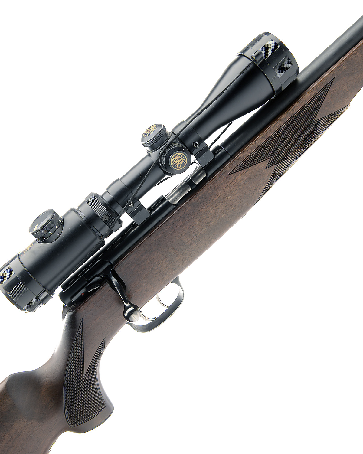 23 1/4in. unsighted nitro barrel, fitted with a RWS 1.5-5x40 telescopic sight, manual safety, detachable magazine, set triggers, 4 1/2in. pistolgrip stock with cheekpiece, sling swivels
