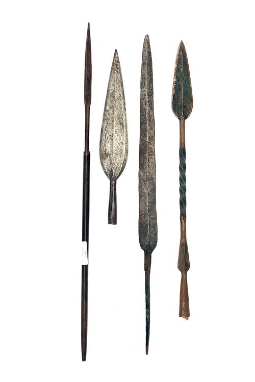 FOUR AFRICAN SPEARHEADS, various forms and dates, one all in wood (4)