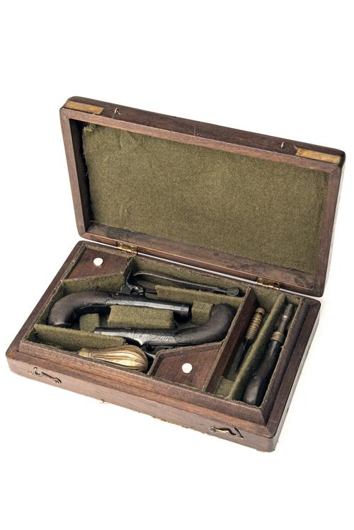circa 1835, with round turn-off 1 3/4in. barrels, broad engraved bands at the muzzles, Birmingham proofs, acanthus engraved round bodies with central hammer boxlock actions signed on the breech blocks 'R. JONES', sliding safes to the top-tangs, finely chequered walnut bag-shaped butts, silver engraved short-tailed butt-caps and concealed folding triggers, complete with a period mahogany case with hook closure, probably original to these pistols and compartmented and lined in green coarse baize with lidded compartments and including a nipple-key, small fluted bodied flask, horn handled turnscrew and scissors bullet mould, also possibly associated