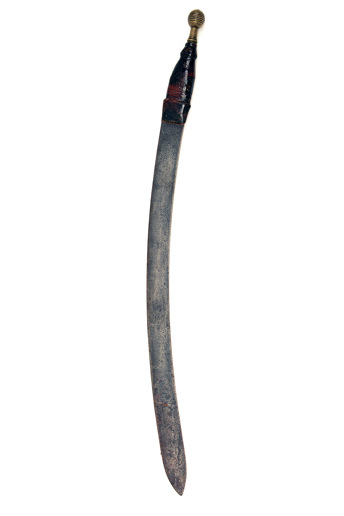 A CURVED SWORD, possibly from Zanzibar, mid 19th century, with broad curving 25 1/2in. blade, guardless hilt bound in leather and mounted with a globular brass pommel, no scabbard