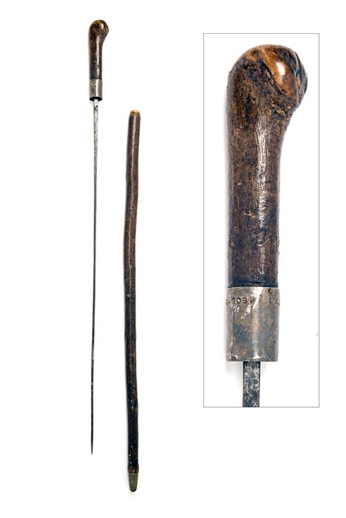 the silver collar with Chester hallmarks for possibly 1854 (rubbed) and marked 'MAJ. R.S. SANDERS G.GDS', with natural hazelwood shaft and pommel and square section 28 1/2in. 'blade'