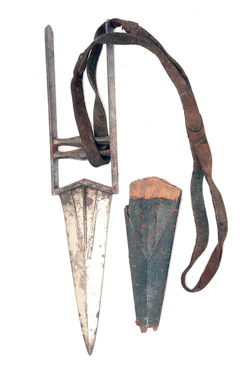 A 19TH CENTURY INDIAN KATAR, circa 1850, with carved central portion to the 8 1/2in. double-edged blade, typical 'rugby post' grip and complete with remnants of its skin covered wood scabbard