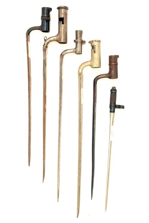 SIX SOCKET BAYONETS, mostly English including an example marked to the East India Company for the India Pattern Brown Bess musket and one for a Russian SKS, all minus scabbards (6)