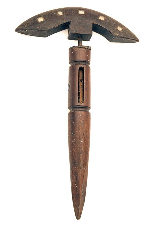 circa 1880 and probably of amateur manufacture, with bowed mahogany 'lure' inset with five reflective squares on each side, the lure spun in the wind and mounted on a turned mahogany ground-spike (some worming)