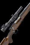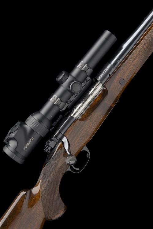 22 7/8in. nitro reproved barrel engraved 'GRIFFIN & HOWE INC. NEW YORK. NY.', ramp-mounted bead fore-sight, the receiver mounted with a detachable WVS L7 adjustable rearsight, with side-mounted Swarovski Z6i 1-6x24 telescopic sight, serial no. R790350486, on a Griffin & Howe marked quickly-detachable rail, the rings with acanthus scroll engraving, Built on a pre-64 Winchester Model 70 action (serial number dates to approx. 1959), jewelled bolt, chequered hollow bolt knob, floral engraved recoil blocks, hinged floorplate with push button release, finely engraved by William V Wild for the current owner with bold acanthus scrollwork on a matted background, with central bright finish roundel with a lone archer and with the engravers initials 'WVW', the triggerguard initialled CJP, figured pistolgrip stock with cheekpiece, monte carlo comb, steel pistolgrip-cap, sling swivels, 13 7/8in. pull including 1in. rubber recoil pad, weight 9lb. 2oz. (open sights) and 10lb. 7oz. (telescopic sight)