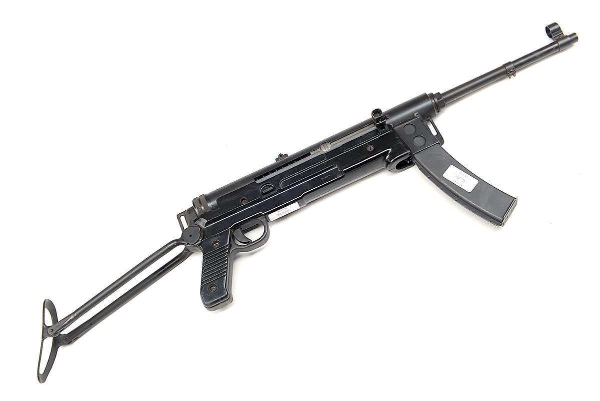 A 7.62x25mm (TOK) SUB-MACHINEGUN, UNSIGNED, MODEL 'M56'- serial no. 33420-C, Yugoslavian, with 10 1/2in. barrel, machined receiver with top ejection port, hard plastic under-body, folding wire butt and curved magazine