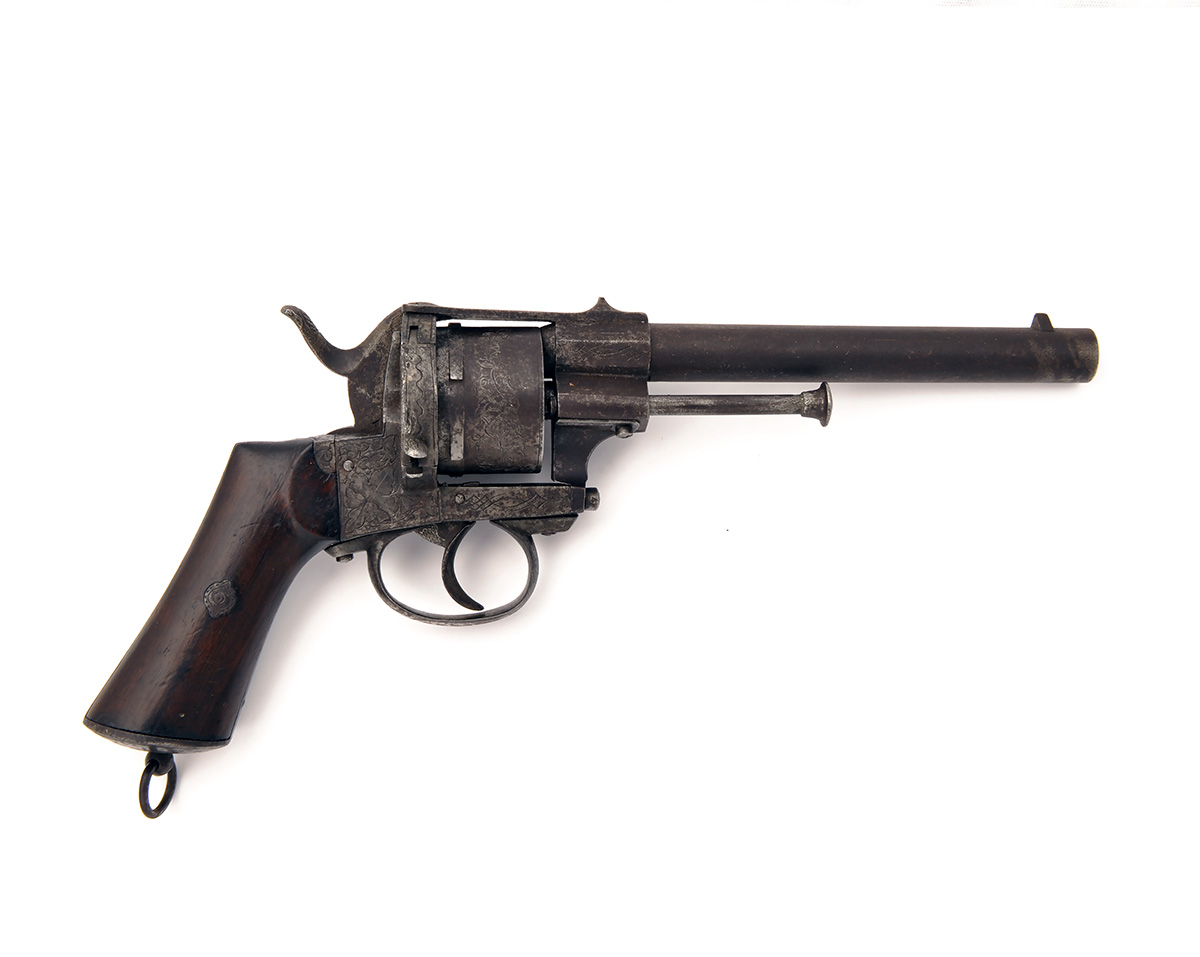 A 12mm PINFIRE SIX-SHOT DOUBLE-ACTION REVOLVER, UNSIGNED, no visible serial number, circa 1860, with round 6 1/4in. barrel, engraved octagonal barrel throat, engraved full frame, spurred hammer, guarded trigger and smooth walnut grip