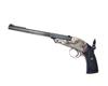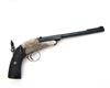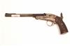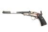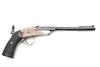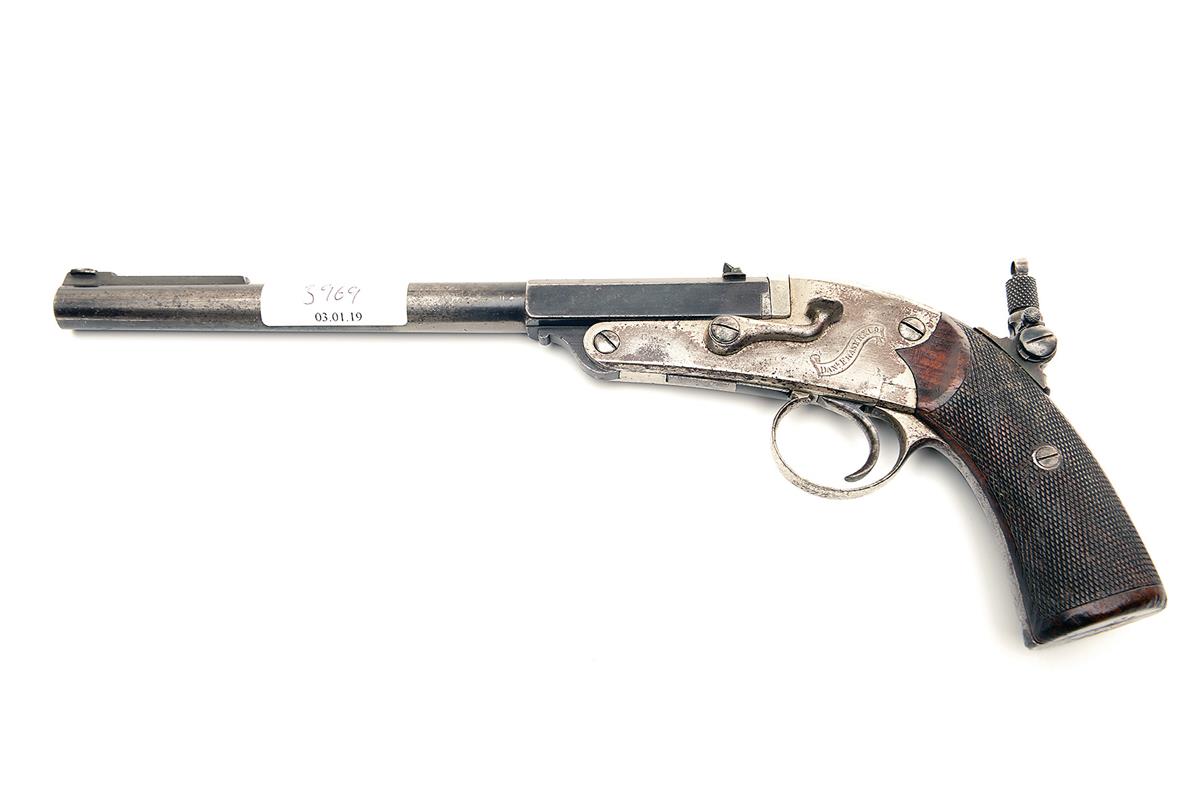 A RARE .230 (RIM) GALLERY-PISTOL SIGNED DANIEL FRAZER, EDINBURGH, serial no. 2375, probably produced on the Continent for retail, with two-stage 8 3/4in. sighted barrel, nickel-plated open hammerless frame, the back-strap with apertures for shoulder-stock (absent) and mounted with a peep-sight, chequered walnut grips and side-lever opening, strong traces of finish remaining