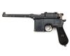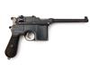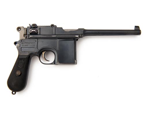 manufactured in 1905, with 5 1/2in. barrel, block and blade fore-sight, elevating 1000m rear-sight, short extractor to the brushed bright bolt, blued receiver and frame, small ring hammer and new style safe, chequered hard rubber grips, much factory blued finish throughout and complete with its matching number walnut holster-stock (cracked along top-edge)