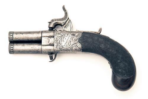 circa 1830, with round turn-off 1 1/2in. barrels engraved at the muzzles (frozen), false rifling, the barrels and breech-blocks numbered '2' and '3' respectively, radiused edge boxlock central hammer action signed on the left 'T. WILSON & CO' within a field of acanthus leaf engraving, the right side signed 'LIVER..L' below the external barrel locking spring also within a field of acanthus leaf engraving (locking spring cracked but present), concealed automatic trigger, sliding safe to top-tang, finely chequered walnut bag-shaped butt and white-metal oval escutcheon to wrist