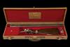 27 5/8in. (70cm) browned nitro barrels (some wear to finish), the rib gold-inlaid 'Armi Famars' and with gold line details at the breech and muzzle ends, the rear lump signed 'MARIO REMO PRIMO TONY', 2 3/4in. chambers, bored approx. 1/4 and 3/4 choke, toplever gold-inlaid with a crown and finely carved with a dragon, manual safety, carved oval fences, rebounding sidelocks with low spurred hammers, articulated front trigger, rolled-edge triggerguard, the action and furniture with fine acanthus scroll engraving, plain polished lockplates with gold line bordering and the makers name in gold, the triggerplate signed 'L. CASARI', 14 1/2in. figured stock, fore-end wood finely inset in gold with the A&S crest, missing finial, weight 7lb. 5oz., in its lightweight leather case with scarlet velveteen interior and gold-tooled leather label