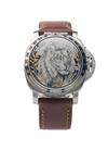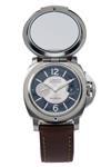 of a proposed limited edition of 100 pieces (never fulfilled), manufactured in 2007, Panerai OPIII calibre 21 jewel movement with glucydur balance-wheel, dual-tone black and silver dial with Arabic numerals at '12' & '6', luminous sword hands, magnified date window at '3', silver subdial for running seconds at '9', brushed stainless-steel cushion-shaped case with protected winder, sapphire crystal glass protected by an internal mirrored hinged stainless-steel face cover, hand engraved in Purdey's workshop with a male lion, the foliage surrounding the image accented with gold and surrounded by an engraved and gold inlaId border also signed 'PANERAI FOR PURDEYS', screw-down back with the make, model and limited edition number, fitted to a brown calfskin Panerai leather strap with signed stainless buckle and complete in its manufacturers presentation box with certificates and outer protective cartons, the whole appearing unworn