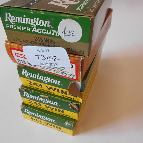 ONE HUNDRED .243 WIN CARTRIDGES BY REMINGTON, comprising of 3 retail cartons of 20 100 grn cor-lokt sp, one norma carton with remington 100grn cor-lokt sp, and one retail carton of remington premier accutip boat tail 75 grn