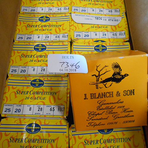 TWO HUNDRED AND FIFTY 20 BORE CARTRIDGES, comprising of 9 cartons of 25, 8 shot, felt wad, 2 1/2in, super competition by gamebore plus one carton of 25 j. blanch and son 6 shot, 7/8ths oz, 2 1/2in.