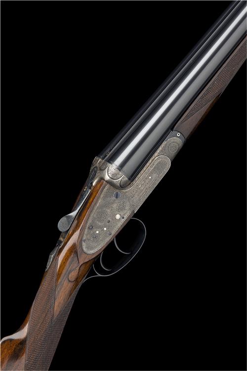 28 1/8in. nitro reproved (in 2018) Whitworth-steel chopperlump barrels, rib engraved 'JAMES WOODWARD & SONS. 64. ST. JAMES'S STREET. LONDON. S.W. MADE OF SIR JOSEPH WHITWORTH'S FLUID PRESSED STEEL', and gold-inlaid '2' at the breech end, 2 3/4in. chambers, bored approx. 1/4 and 1/2 choke, left wall thicknesses well below recommended minimum, action with carved arcaded fences, removable striker discs, toplever gold-inlaid '2', automatic safety with gold-inlaid 'SAFE' detail, gold-inlaid cocking-indicators, best fine acanthus scroll engraving with floral bouquets, retaining traces of renewed colour-hardening and finish, 15 3/4in. replacement stock with ink enhanced figuring, replacement fore-end wood, weight 6lb. 8oz.