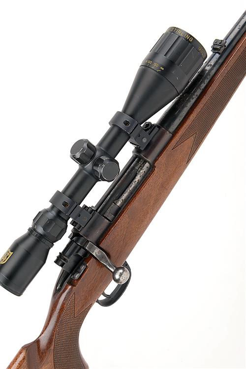 MIDLAND GUN CO. .243 WIN. BOLT-MAGAZINE SPORTING RIFLE, serial no. 15689, 24in. nitro barrel, fore-sight missing, folding leaf rear-sight, fitted with a Nikko Stirling 3-9x42 telescopic sight, manual safety, hinged floorplate,