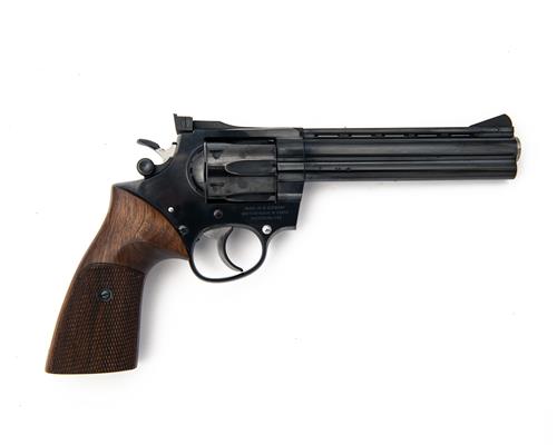 for 1980, with finely blued 6in. barrel, full-length integral under-barrel weight, raised ventilated sighting rib with ramped fore-sight and micro-adjustable rear-sight, blued fluted cylinder, blue-printed action, bright hammer and trigger, chequered walnut anatomical right handed target grip, appearing little used together with its makers hardwood storaged case with outer protective plastic panels, lining removed, and instructions