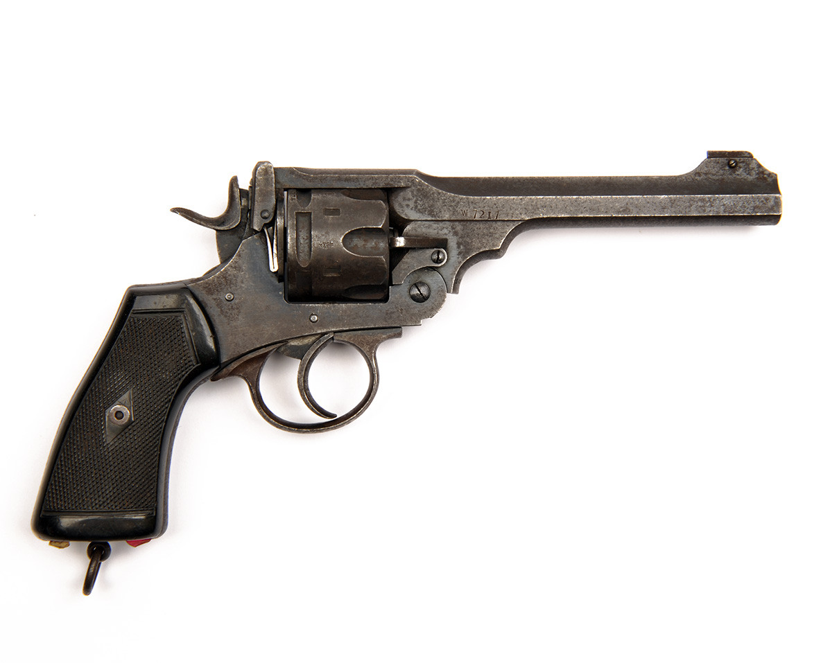 * A .455 SIX-SHOT SERVICE REVOLVER SIGNED WEBLEY & SCOTT, MODEL 'MKVI', serial no. 201774, dated for 1916, with 6in. barrel, break-open frame with auto-ejecting fluted cylinder and chequered hard-rubber grips and lanyard ring at heel, finish stained