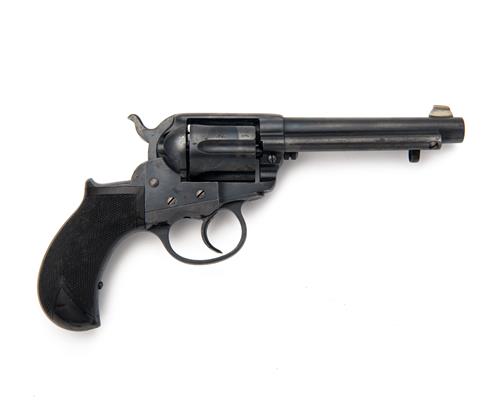 for 1880, the tapering round 4 1/2in. barrel signed on two lines 'COLT'S PT FA. MFG. CO. HARTFORD CT. USA' over 'DEPOT 14 PALL MALL LONDON', working replacement beaded blade nickel fore-sight, sighting groove to the top-strap, solid frame with long-fluted cylinder and side loading gate, double action mechanism, chequered rose-wood birdshead grip, the whole an older refinish