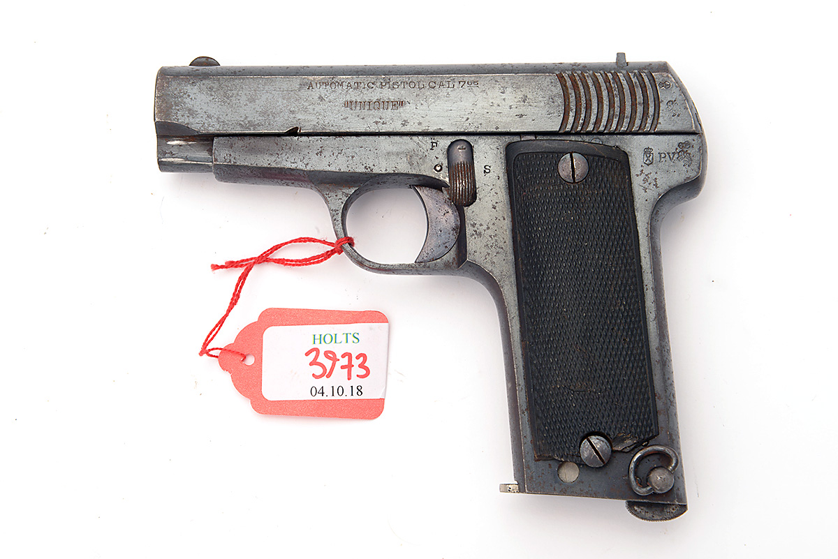 ** A 7.65mm (.32 ACP) SEMI-AUTOMATIC PISTOL SIGNED 'UNIQUE', serial no. 19887, with 3 1/2in. barrel, blued receiver and slide stamped 'AUTOMATIC PISTOL CAL. 7.65MM. "UNIQUE".', black chequered hard-rubber grips (some losses)