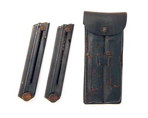 A SCARCE TWIN LEATHER MAGAZINE POUCH FOR A P08 LANGE or 'LUGER ARTILLERY' WITH TWO NAVY MAGAZINES serial no. 4068,